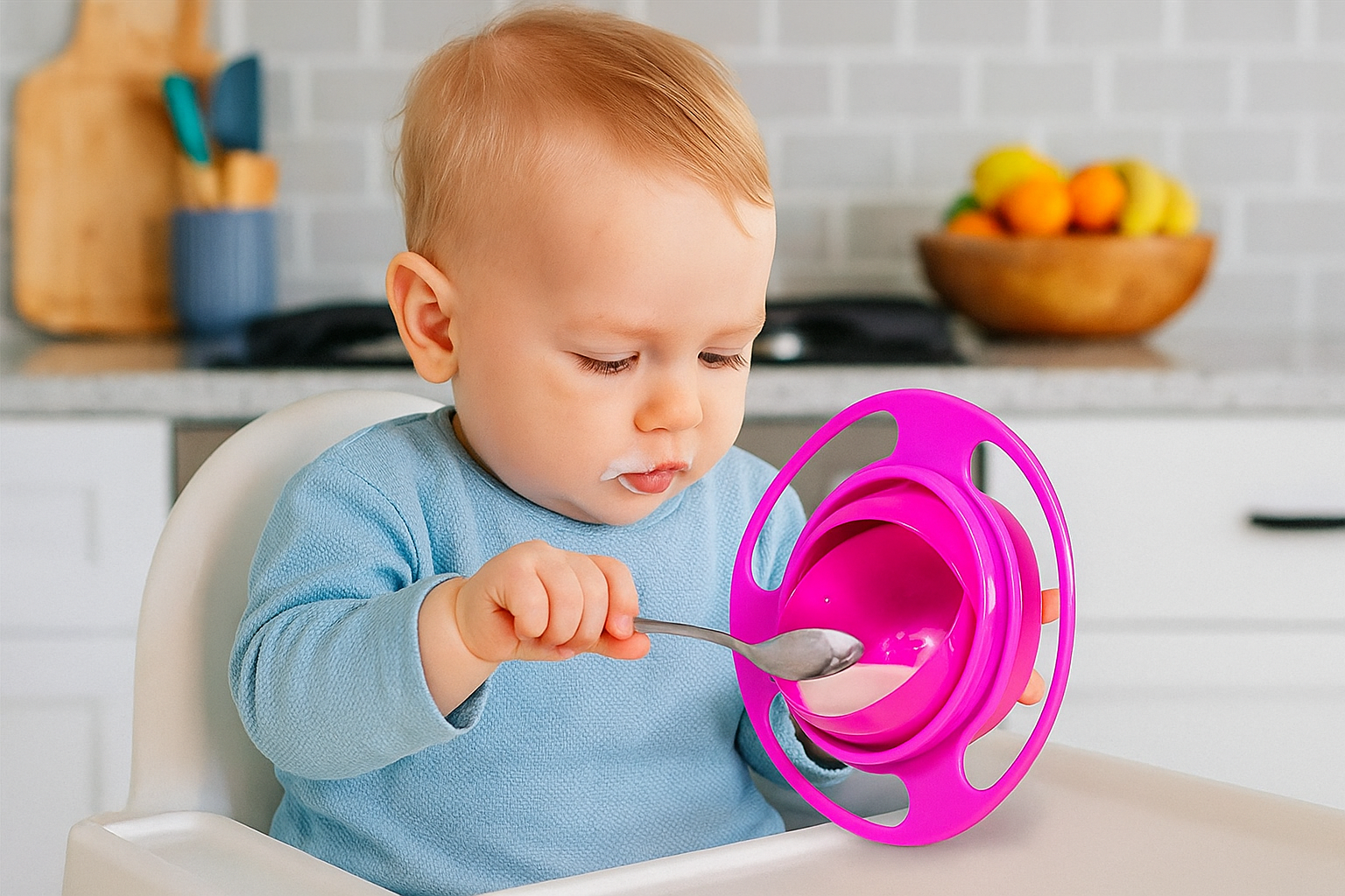 Sí 🙌. Su diseño con rotación de 360° mantiene los alimentos dentro del tazón incluso si el niño lo gira o lo voltea. Ideal para snacks, frutas o cereales sin accidentes. 🍎